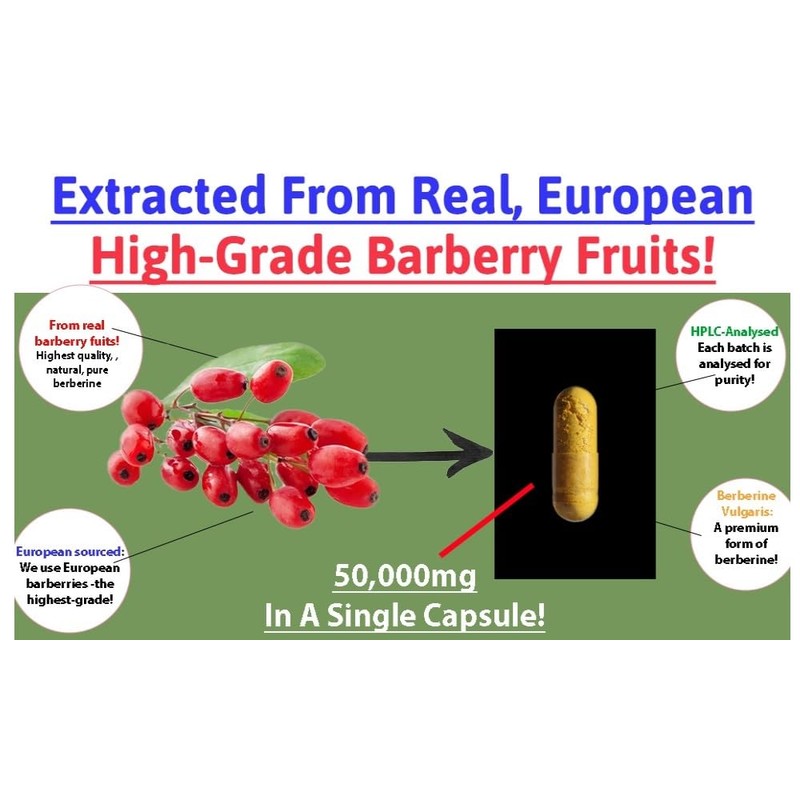 HIGH STRENGTH - Berberine HCL 50,000mg! (500mg with an Extraction Ratio of 100:1). This is the Absolute Highest Possible Strength Available.