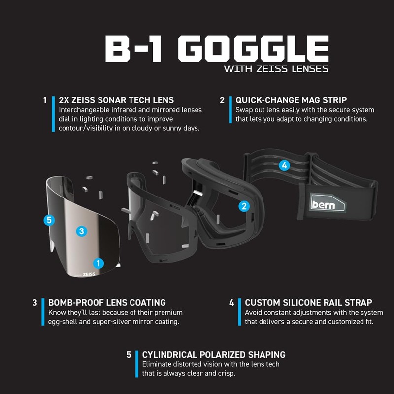 BERN B-1 Large Fit Snow Goggle for Men for Women Magnetic Change Dual Zeiss Sunny and Cloudy Lens with Bag, White