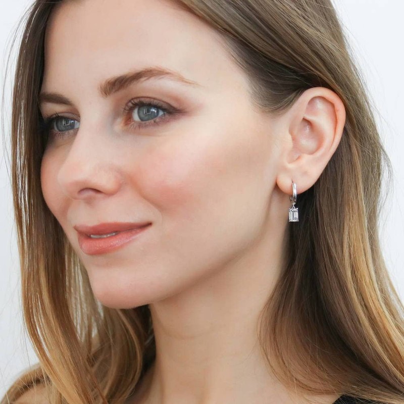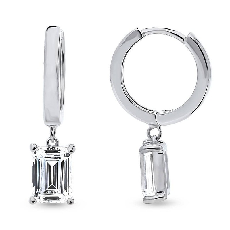 - Nickel-Free: Designed with your comfort in mind, safe for sensitive skin, ensuring irritation-free wear. Features premium grade 2 ct.tw emerald cut cubic zirconia CZ (7mm x 5mm). Hinged snap backs. Measures 0.84"(L), 0.5" in diameter.