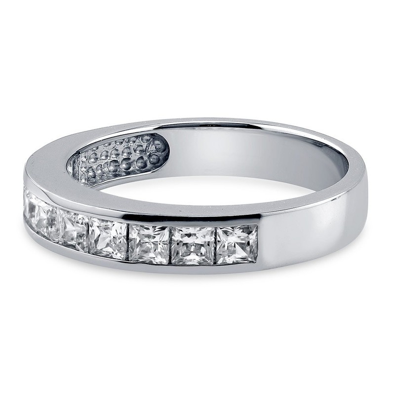 This half eternity band dazzles with a simple, sophisticated design. Crafted with fine 925 sterling silver, rhodium plated, nickel free. Set with premium grade 1.8 ct.tw princess cut cubic zirconia CZ (3mm) in channel setting. Measures 3.5mm in band width, 3.1mm in height. Imported.