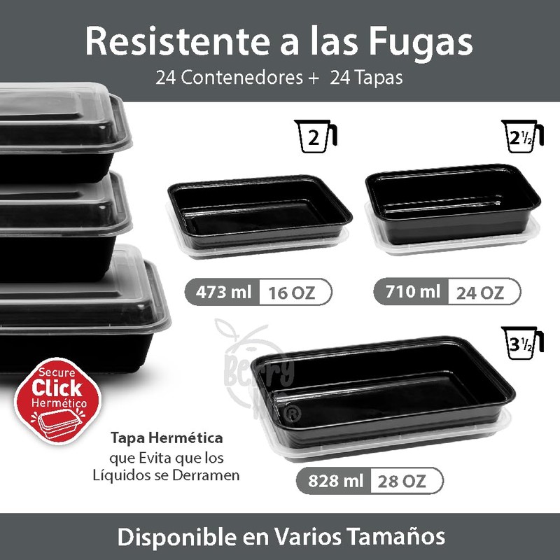 - Este set de 24 contenedores rectangulares con tapa transparente que cierran herméticamente evitando cualquier tipo de derrames