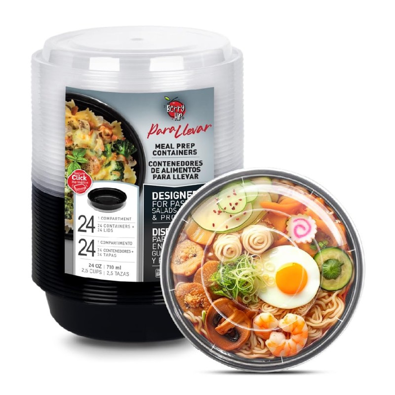 Berry Hip 24 Contenedores para Alimentos Reutilizables de 710 ml (24 oz), Tipo Bowl Hondo con Tapa Transparente, Para Microondas, Congelador y Lavavajillas, Fáciles de Limpiar, Apilables y Ecológicos