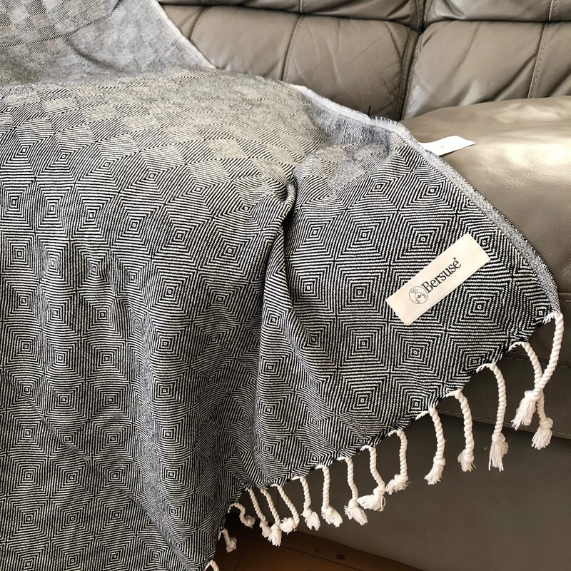 Bersuse 100% Cotton Milas XL Throw Blanket Turkish Towel - 60x90 Inches, Black