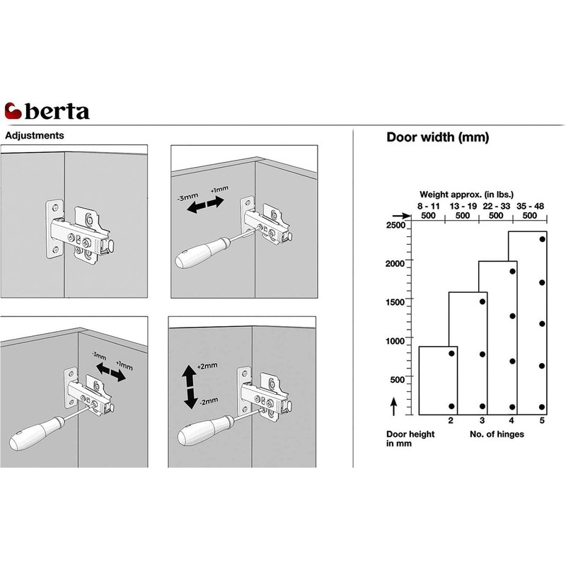 - FULL OVERLAY DESIGN: These hinges will have a straight arm and it allows your cupboard door edge to be completely in line with the edge of your cabinet. One major advantage of a full overlay concealed hinge is that it is fully adjustable due to three little screws that they have. Depth, Side and Height adjustments are made with these three screws. They can be fine-tuned to ensure the door frame is totally concealed and fits together perfectly.