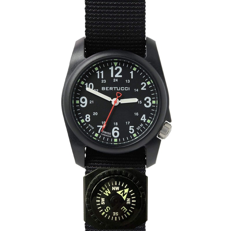 Bertucci Mens Black Dial Nylon Band Quartz Watch - 11102. The DX3 Compass offers classic design, a U.S. Patented durable fiber reinforced Uni-Body case and packed with performance features... including an R-TYPE hardened mineral glass crystal, offset ergonomic crown, long-lasting precision movement, 3 year battery, U.S. Patented heavy-duty B-TYPE nylon webbing band, and Swiss super luminous hands & markers. Equipped with a removable high quality liquid filled, assembled in USA, compass.
