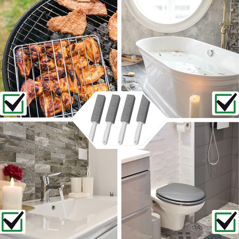 - Escobilla multifuncional de piedra pómez para inodoros: tamaño del producto 24.1 * 3.8 * 3.8cm, juego de 8. La piedra pómez se utiliza en inodoros para limpiar depósitos de calcio, cal e hidratación dura de superficies cerámicas como inodoros, lavabos y azulejos de baño. También puede utilizarse para eliminar la grasa de parrillas y hornos. También puede utilizarse para limpiar piscinas, azulejos, cocinas, etc.