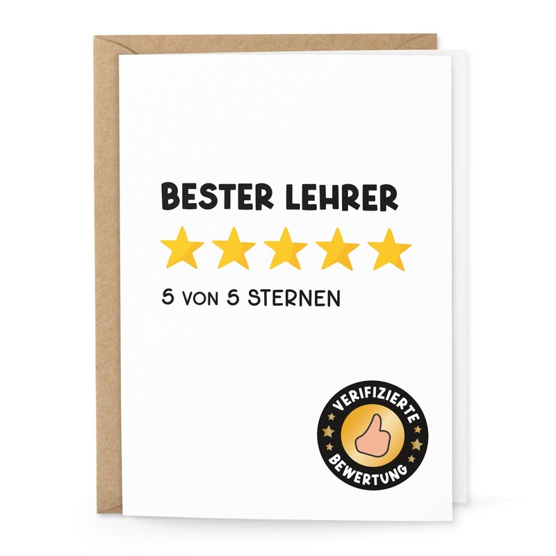 - Bester Lehrer Dankeschön: Überrasche den besten Lehrer mit dieser humorvollen Dankeskarte im "5 von 5 Sternen" Design, ideal als Anerkennung für unermüdlichen Einsatz und hervorragenden Unterricht.