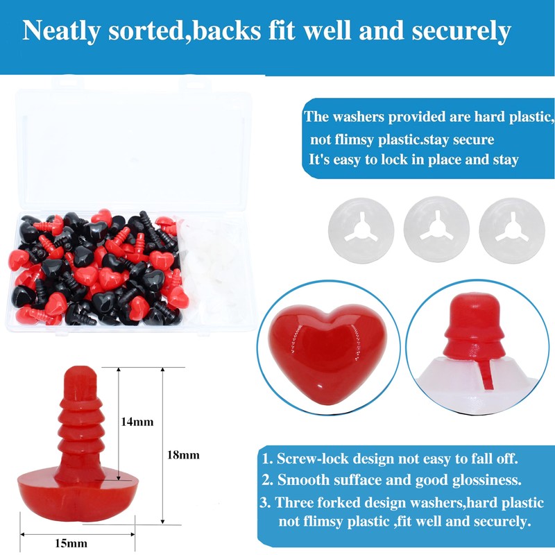 - Safety eyes and washers in a plastic box making it easy for organizing. 1box(100pcs) includes 50pcs(25pcs black + 25pcs red) amigurumi eyes and 50pcs three forks designed washers ranging