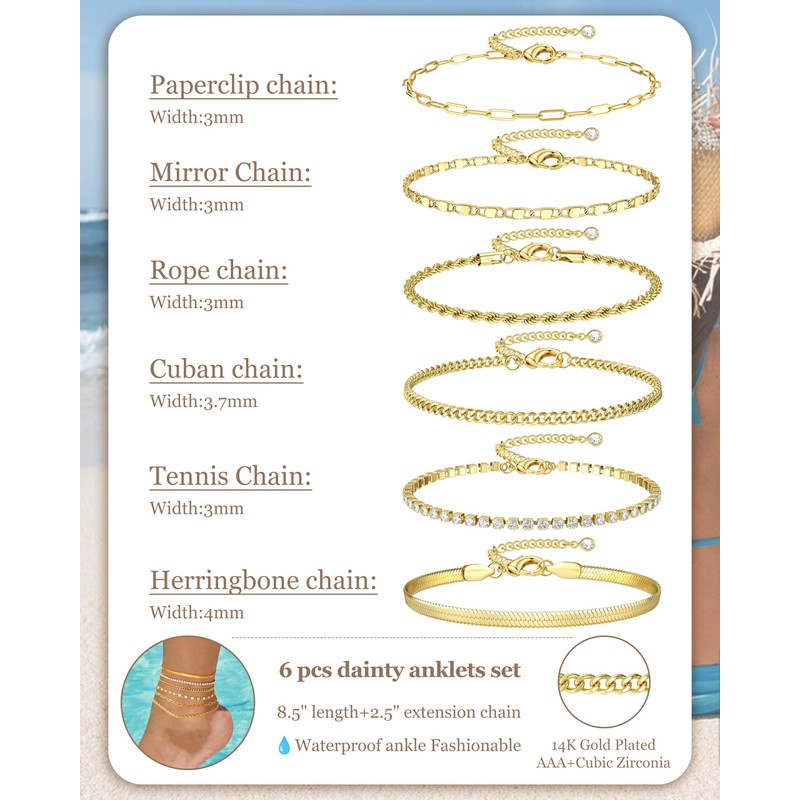 - 6-Piece Premium Waterproof Anklets Set for Women:Crafted from stainless steel, this non-tarnish gold anklet set includes Cuban link, herringbone, figaro, paperclip, rope & satellite chains. Each waterproof anklet for women withstands swimming, showers, and daily wear without fading. Hypoallergenic and nickel-free, perfect for sensitive skin.