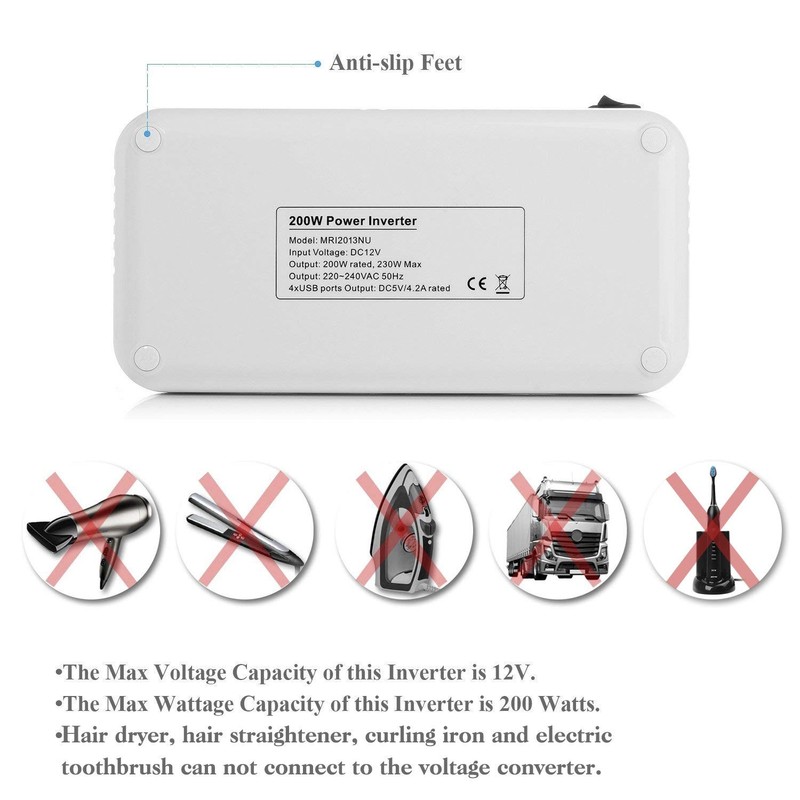 -Verwenden Sie diesen Stromwandler nicht für Haartrockner, Haarglätter oder Lockenwickler, unabhängig von seiner Leistung