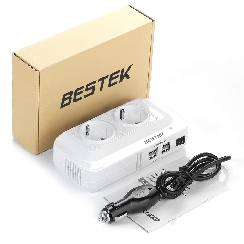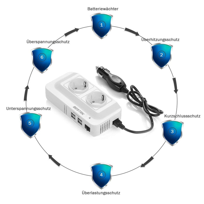 BESTEK 200W KFZ Spannungswandler Wechselrichter DC 12V auf AC 230V mit 2 Steckdosen und 4 USB Autoladegerät inklusive Zigarettenanzünder Stecker Weiß