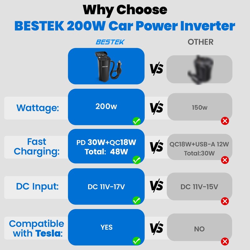 - 【Compatible with Tesla】The input voltage of the inverter is 11-17V, perfectly suitable for the 16V cigarette lighter socket of Tesla vehicles.