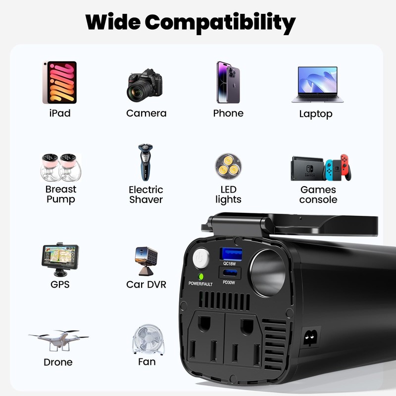 - 【Upgraded 200W Power Inverter】Car power inverter provides 200 watts continuous DC to AC power and 500 watts of peak power. It equipped with 2 AC outlets, QC3.0 18W USB- A port, and PD 30W USB-C port. Perfect for charging string lights, laptop, breast pump, CPAP machine, nebulizer, game console, camera, iPad, and other electronic devices.