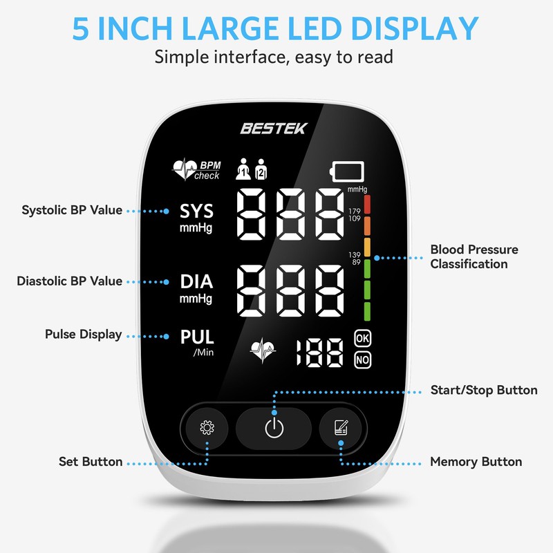 BESTEK Blood Pressure Monitor, Automatic Arm Blood Pressure Monitors for Home Use, Digital Large LED Voiced Broadcast BP Cuff Comfortable and Portable for Home Travel (9"-17" Adjustable)