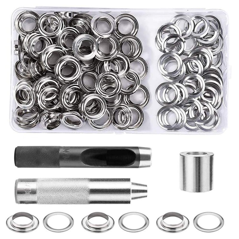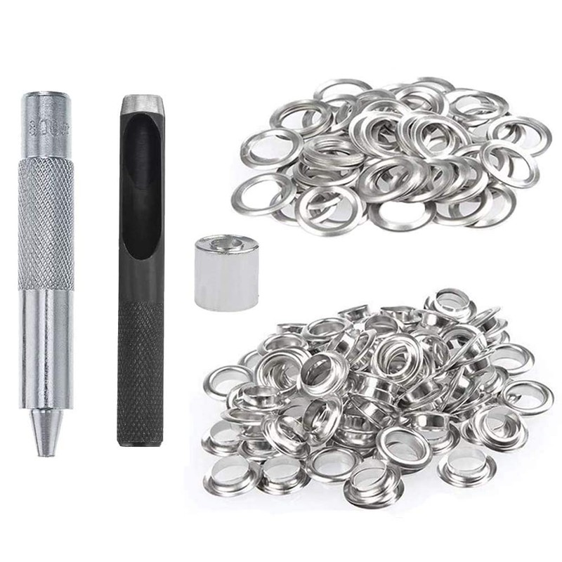 - Combinations: grommet kit set includes 100 sets of grommets eyelets (each set includes 1 eyelet and 1 washer), a hole cutter, a matched mandrel and a storage box.