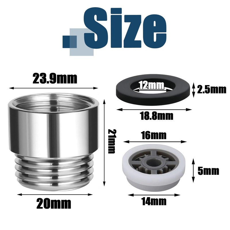 - Dimensions - Water flow reducer size: 0.63'' x 0.55'' x 0.2'' / 16mm x 14mm x 5mm; 1/2'' Restrictor valve thread diameter: 0.94'' /23.9mm, overall length 0.83'' /21mm; The washer outer diameter: 0.74'' /18.8mm.
