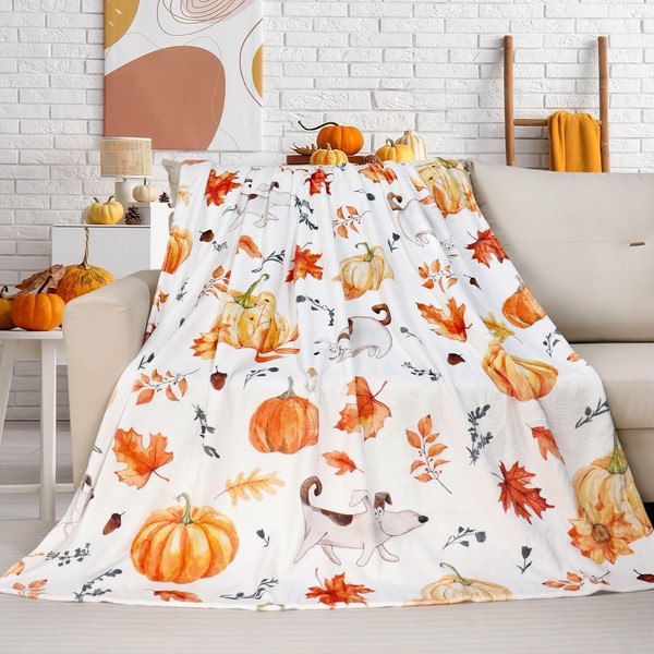 Bestraily Fall Orange Pumpkin Throw Blanket Thanksgiving Harvest Lightweight Flannel Fleece Throw Blanket Autumn Happy Dog Throw Blankets Cozy Fuzzy Plush Throw Blankets for Bed Chair Couch 60" X 80"