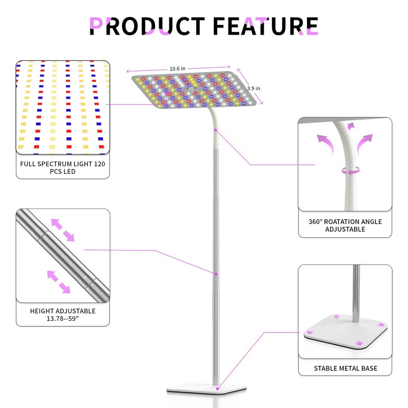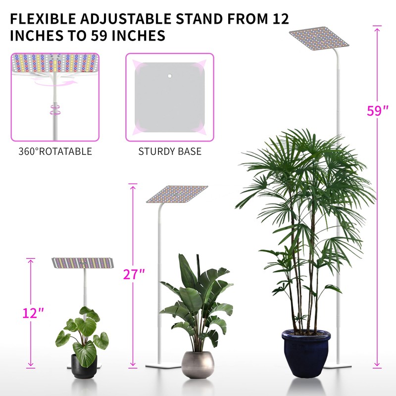 • Floor Grow Light with Adjustable Stand:This grow light lamp with a stable metal base that allows you to place it on the floor or tabletop and adjust the head height from 12 to 59 depending on your application. The flexible gooseneck can rotate 360 degrees, allowing you to easily adjust the height and angle you need to suit your plants!