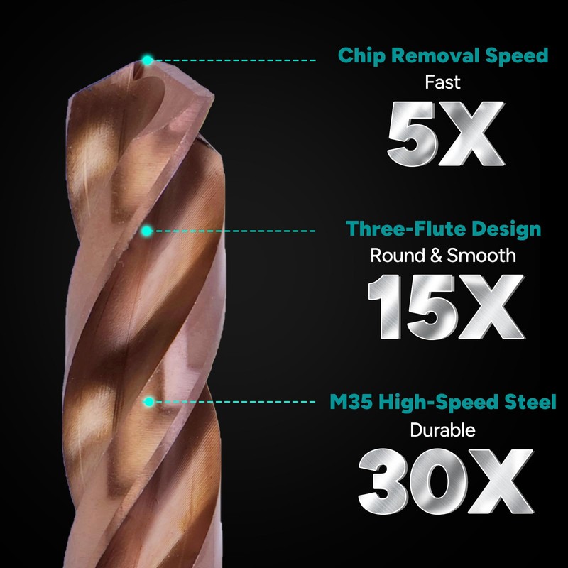 - Three-Flute Design: The special three-flute design enables the drill holes to have higher roundness, smoother walls, and better chip removal and heat dissipation