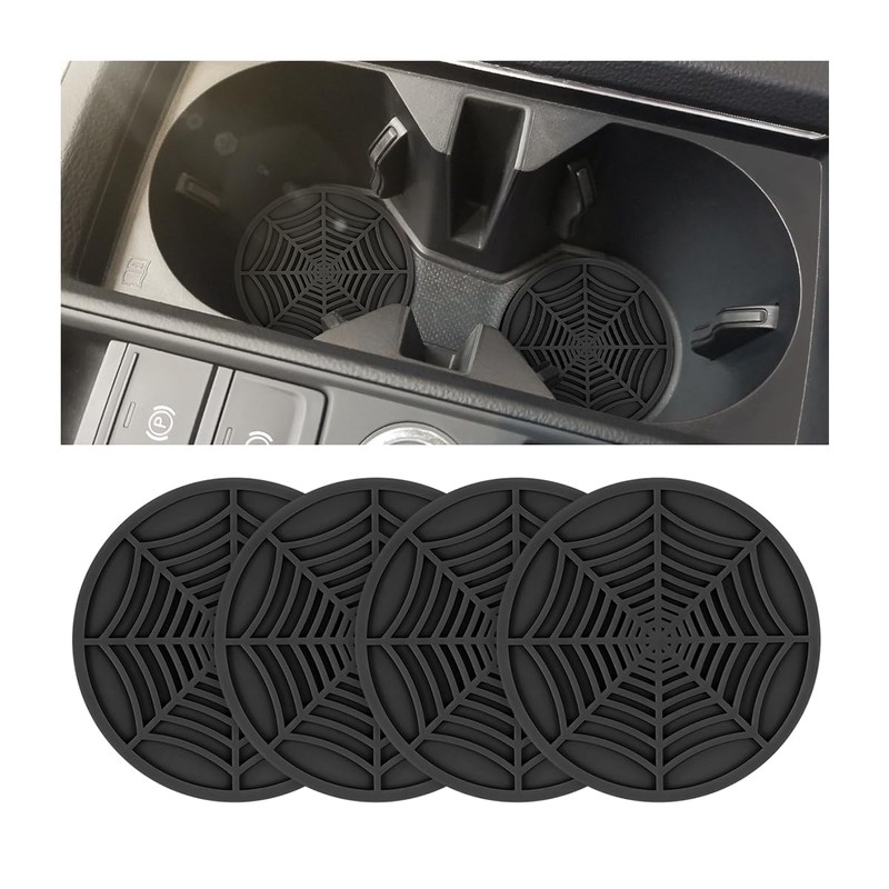 BESULEN Car Cup Coasters, 4 Pack Spider Web PVC Non-Slip Drink Mat, 2.75 Inch Universal Auto Cup Holder Insert Drainage Coasters, Car Interior Accessories Ornaments for SUV, Truck, Sedan (Black)