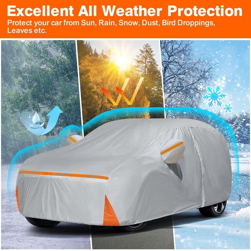 - All-Weather ProtectionMade of high quality PE&PEVA, the pilot car cover has excellent performance such as waterproof, heat-resistant and quick-drying. The outer layer is coated with a water-resistant coating to ensure that the cover can withstand strong water pressure, making it ideal for use in rainy and snowy days. Highly reflective anti-UV coating can keep the car cool even on sunny days. The thicker cotton in the lining will protect the car paint better.
