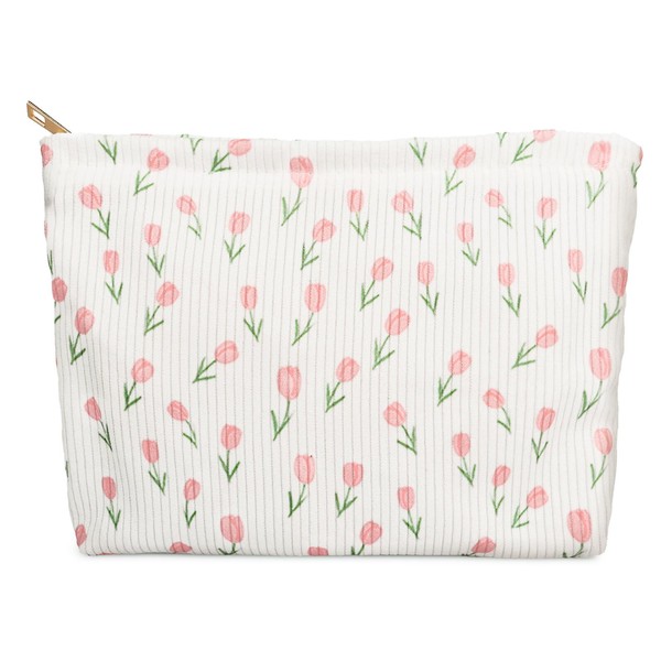 - Spring tulip print: the white corduroy cosmetic bag with soft pink tulips brings floral elegance to your everyday life. Ideal for those who love fashionable designs while being practical on the go.