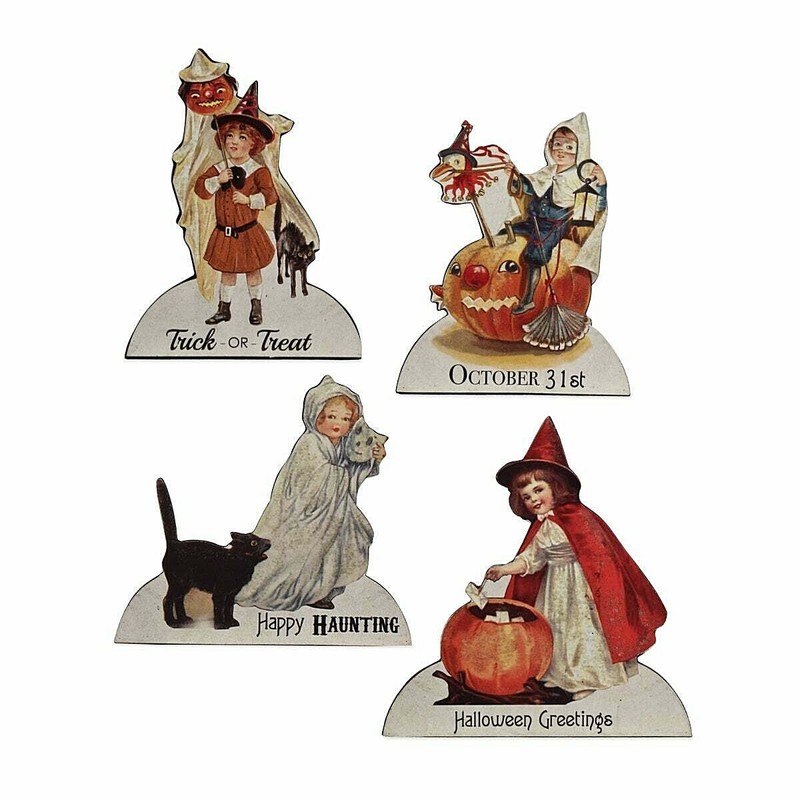 What a great addition our  "Trick or Treat Child Dummy Boards    would make to your Halloween decorations!      ~~  Made of MDF Board with metal easels on back.    ~~ Measurements :       5” Tall  x  4” Wide  (for each one)  ~  great size for decor.    Designed with that classic Bethany Lowe style that will adorn your home for years to come.    ~~ Includes one set of (4)  Trick or Treat Child Dummy Boards  ~~  One of each pictured.    ~~ FREE SHIPPING   included  with purchase.