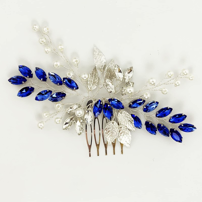 - 【Handmade Design】- This rhinestone bridal hair piece is hand wrapped by silver color alloy wire with leaf & pearl & clear & no-fade blue (or red) rhinestone on silver color pins comb, elegant and easy to wear, good assistant for your make up and easy to DIY your own hairstyle