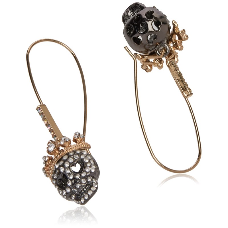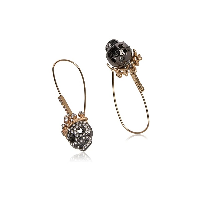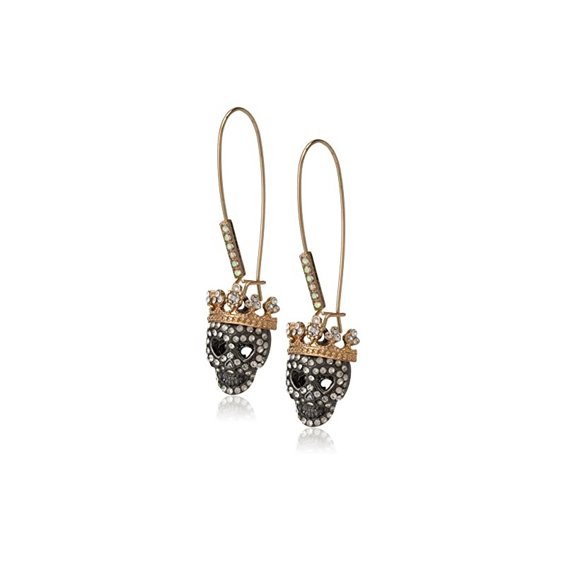 - Dangle earrings featuring long ear wire with stones, and sleek skull drop embellished with pave stone accents and regal crown detail. Earrings are set in gold and hematite-tone metal with a shepherds hook closure.