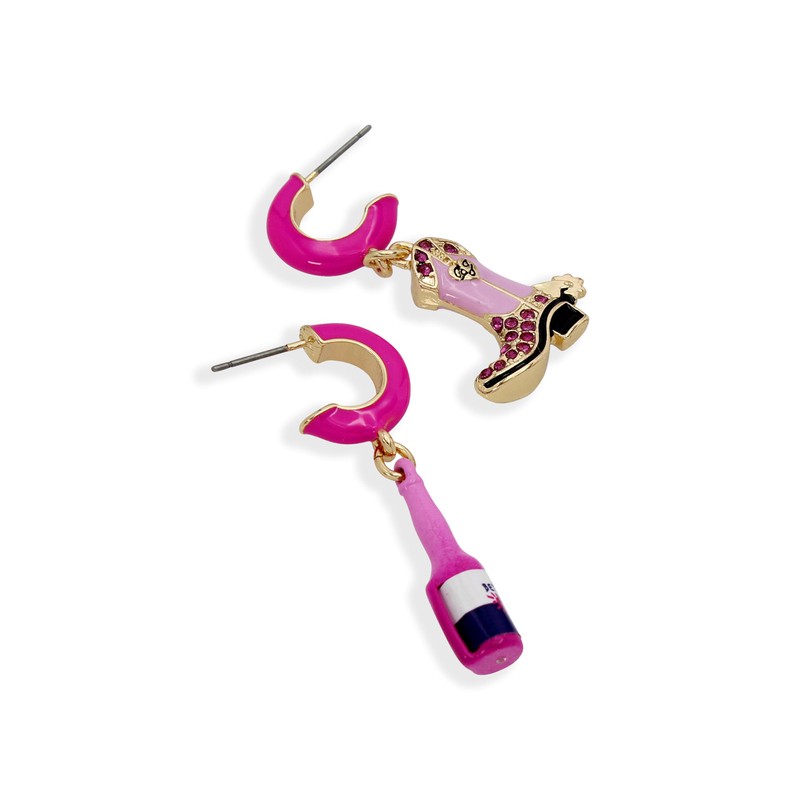 - TRENDY EARRINGS : Vibrant fuchsia enamel huggie hoop earrings featuring dangling festive charms including cowgirl boot and signature Betsey brew. Coordinating charms are mismatched.