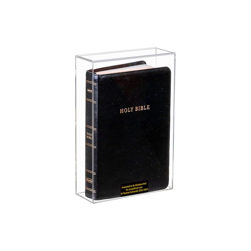 - High quality acrylic table top book display case with custom name plate; memorabilia cube comes fully assembeled