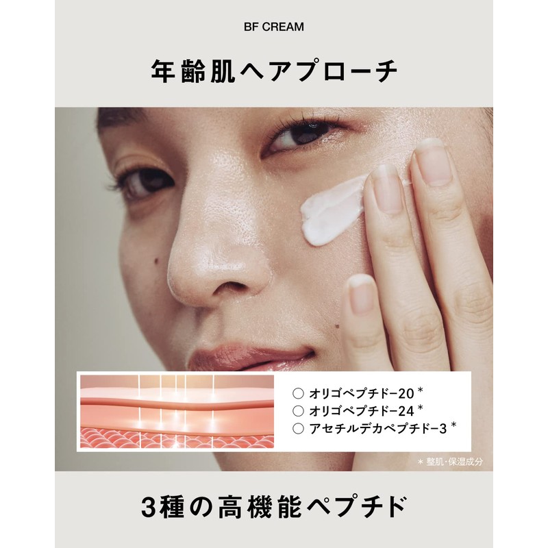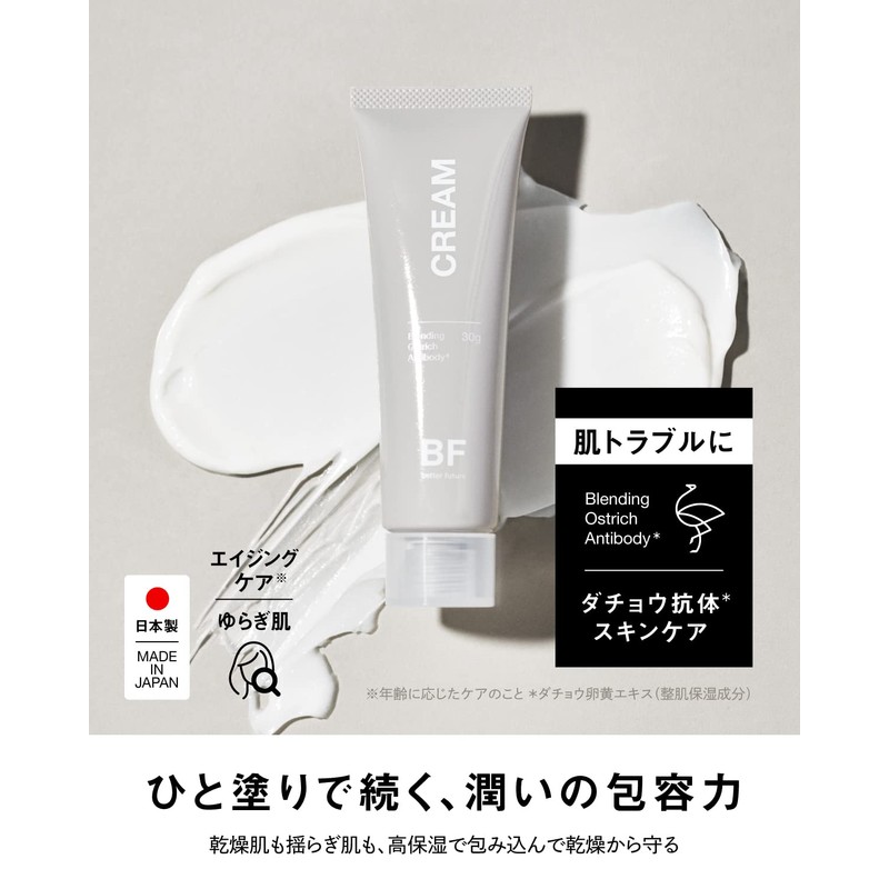 (BF Cream, Moisturizing Cream) (Moisturizing Cream) An ostrich antibody formulated cream that envelops dry and swinging skin with high moisturization. Rich texture protects against dryness and provides a clean and firm skin. * Ostrich egg yolk extract (moisturizing ingredient).