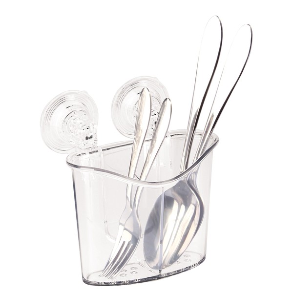 2 strong plastic suction cups adhere to smooth sink surfaces. Convenient way to dry cutlery & cooking utensils. This Clear holder drains and dries cutlery fast, so counters are residue free. Ideal for the house, office, RV, boat.... its two suction cups adhere to any flat surface, such as glass, mirror, tile, or metal. It is big enough to hold lots of cutlery.
