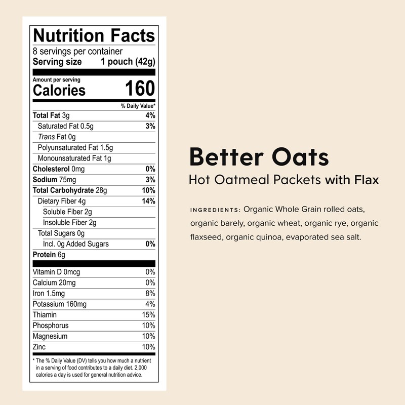 Better Oats Organic Instant Multigrain Hot Cereal with Flax - Kosher Pareve, 11.8 oz (6 pack of 8 Pouches)