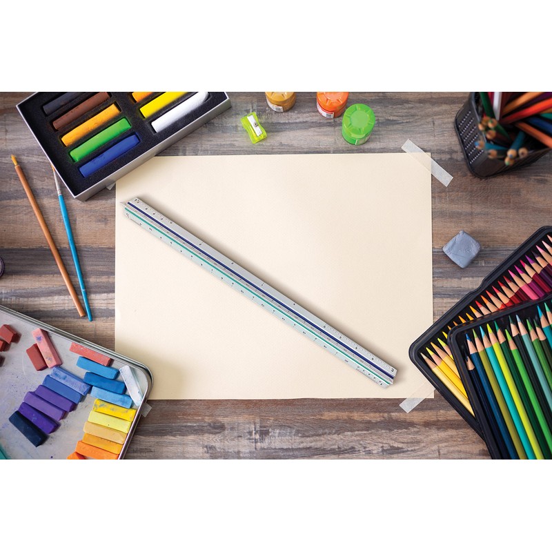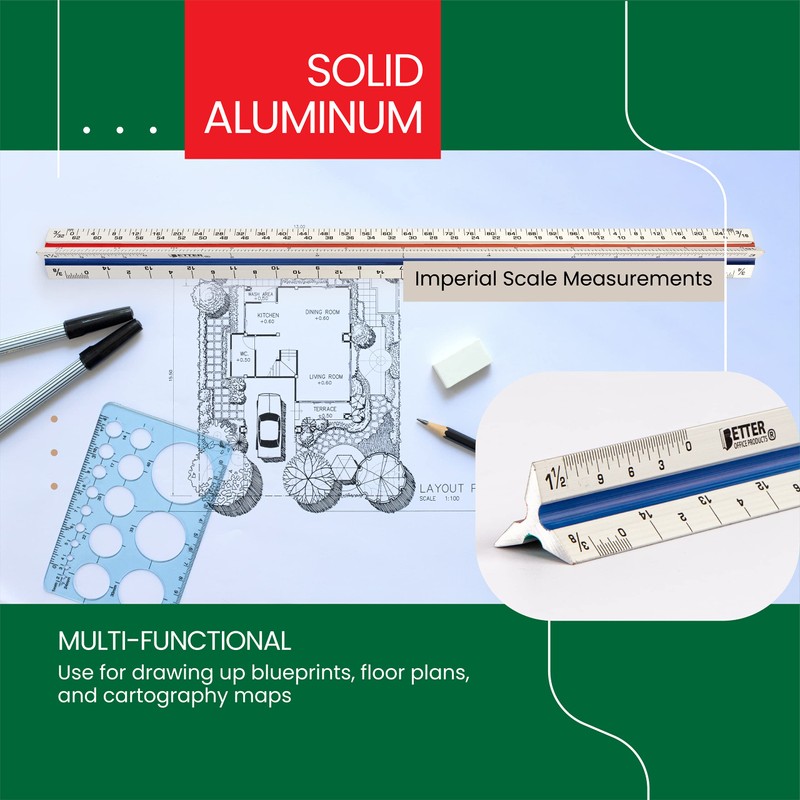 12-inch triple-sided, color-coded triangular ruler made of solid aluminum. Architectural ruler for drawing up blueprints, floor plans, and cartography maps. Color-coded sides include the following scales: GREEN: 1/8", 1/4", 1/2", 1"; BLUE: 3/8", 3/4", 1-1/2", 3"; RED: 3/16", 3/32", 1" (16)