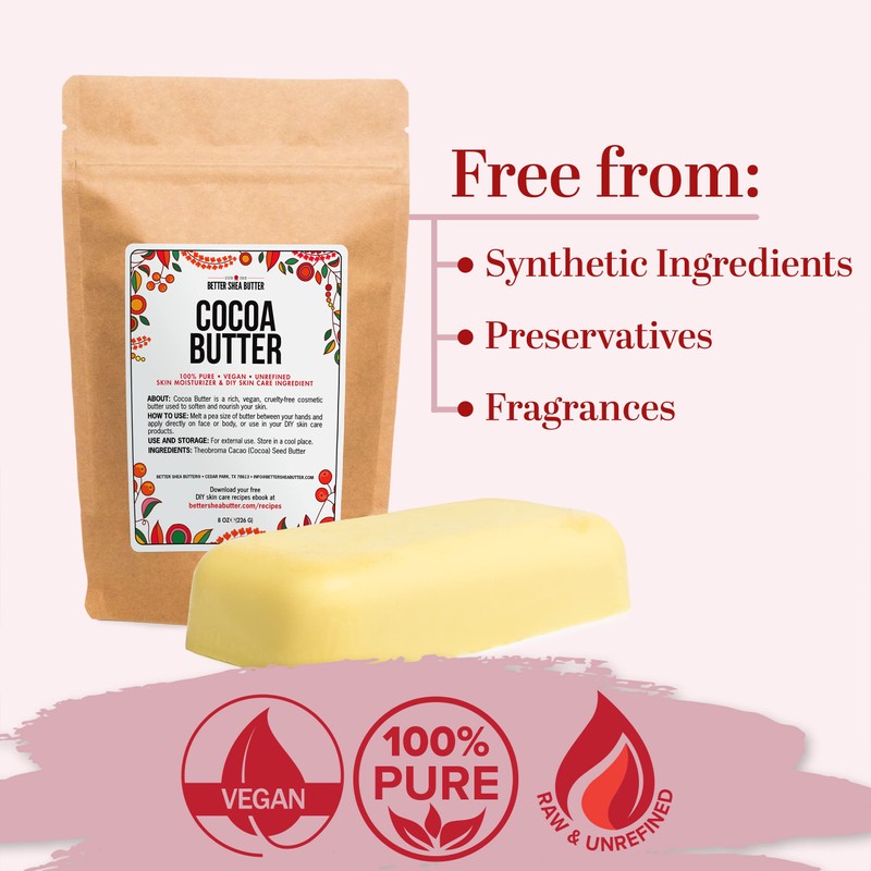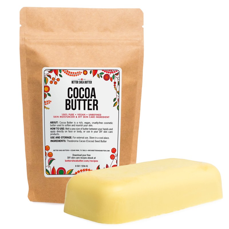 Better Shea Butter Raw Cocoa Butter - Unrefined, 100% Pure, Food Grade - Use for Cocoa Lip Balm, Stretch Marks Cream, Cacao Butter Cream, Scars Oil, Whipped Lotion - Skin & Hair Moisturizer 8 oz Block