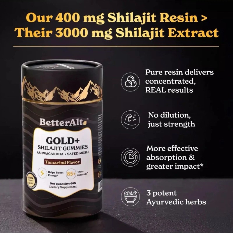 BetterAlt Gold+ Shilajit Resin Gummies with Ashwagandha-60 Gummies