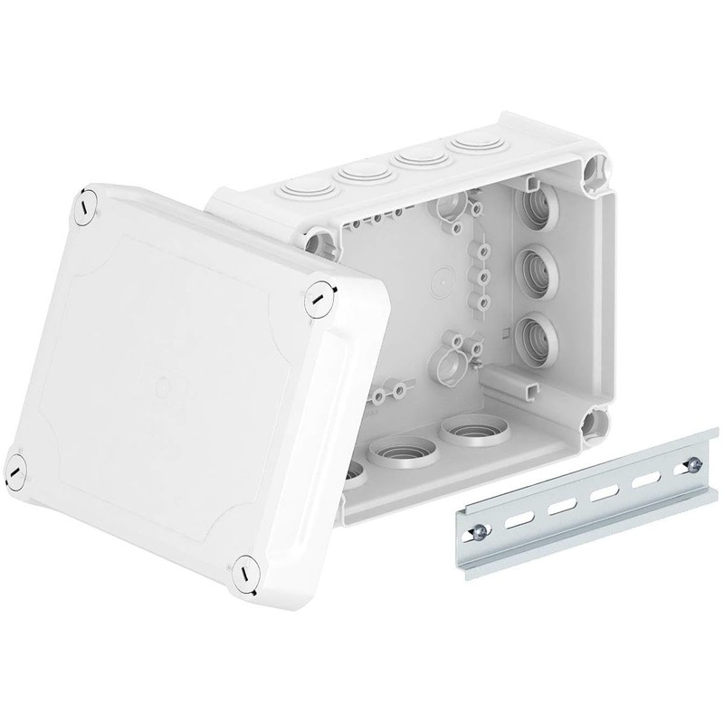 Important note: Please note that electrical engineering work must only be carried out by electricians or under their supervision and supervision. Please note if necessary. different country-specific standards and regulations of electrical installation and consult a local electrical installer. Devices with a connection value > 380 V/400 V require a high current connection and may only be connected by an approved electrician. For devices with a rated power > 12 kW, you need the approval of your network operator (Germany, other countries may different). Cable junction box with transparent Cover T 160 HD TR assembly without, shape rectangular, mounting type wall/ceiling mounting, introduction from the back, length 190 mm, width 150 mm, depth 94 mm, stackable, number of entries 12, type of housing feedthrough other, material plastic, halogen-free, surface protection untreated, colour grey, protection class (IP) IP66, lid attachment screwed, sealable, rated insulation voltage Ui 500 UV, function retention without, weather-resistant, operating temperature -5 to 60°C, for ex-zone gas without, for ex-zone dust without, cable junction box for connecting cables and cables indoors and protected outdoor areas. Rectangular shape with insertion seals on the sides and rash entries in the base. Suitable for wall/ceiling mounting and mounting on mounting plates. With the possibility of internal mounting and mounting via the corner dome. High transparent lid with quick release, sealable. Made from halogen-free and UV stabilised materials. Includes hat profile rail. Cable junction box according to DIN EN 60670. Flame retardant according to DIN EN 60695-2-11, test temperature 650°C. Impact resistance IK05 according to DIN EN 50102.