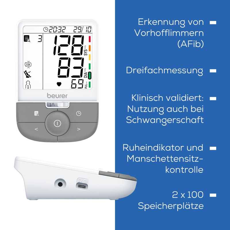- Precise measurement: thanks to the triple measurement recommended by doctors, the patented rest indicator and the cuff seat control, a precise measurement with exact measurement results is ensured