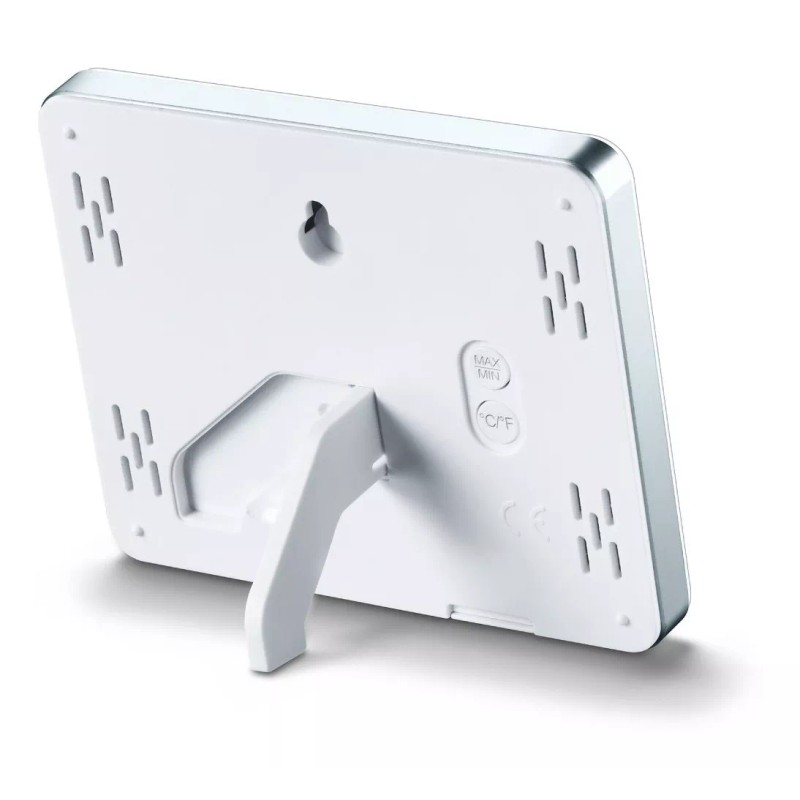 El termohigrómetro tiene una opción para colgarlo en la pared y un soporte de mesa plegable