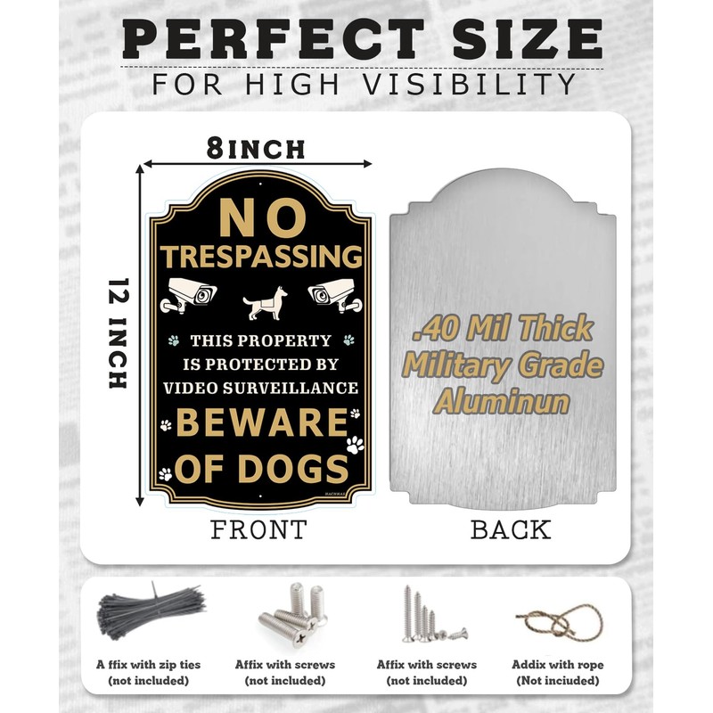 - TOUGH MESSAGE, STYLISH LOOK --- This black and gold sign is more than just elegant—it's loud and clear: no trespassing, video surveillance, and dogs on duty.