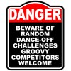BEWARE OF RANDOM DANCE-OFF CHALLENGES GROOVY COMPETITORS WELCOME Danger Red Black Aluminum Composite Sign 8.5 x 10 inches