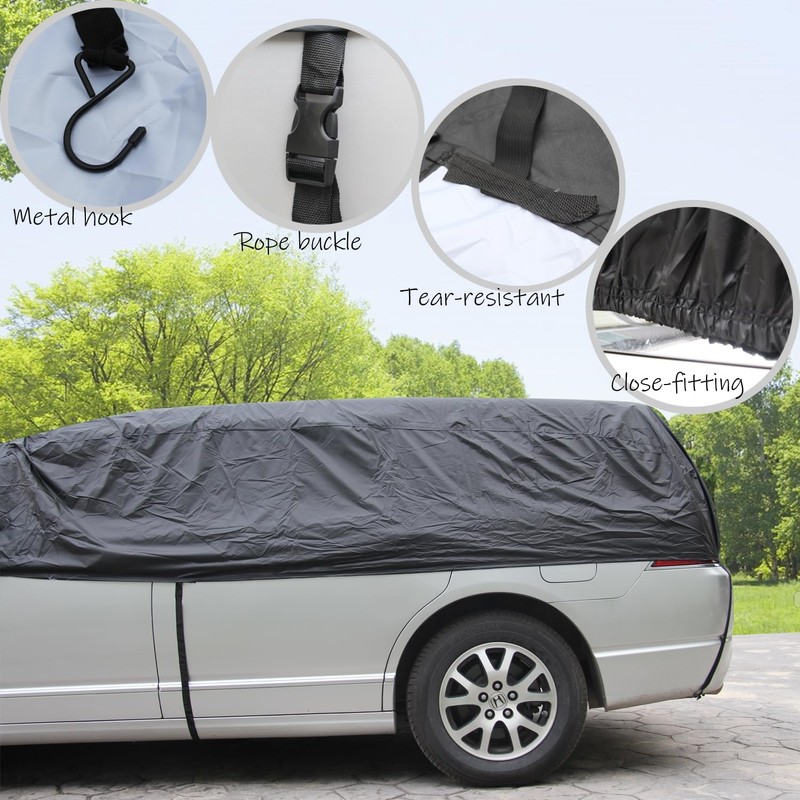- 3. Im Vergleich zur kompletten Autoabdeckung kleiner in der Gr??e fr einfache Installation. Schtzen Sie das Autodach im Winter vor Regen, Staub, Vogelkot, Baumharz, Schnee oder Eis. Die halbe Autoabdeckung erleichtert Ihnen das Einfahren am n?chsten Tag.