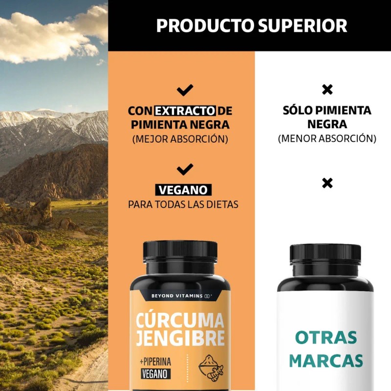 - Presentamos Beyond Vitamins Cúrcuma + Jengibre, la combinación perfecta de ingredientes premium diseñada para elevar tu rutina diaria a nuevos niveles de vitalidad. Cada porción contiene 1000mg de raíz de cúrcuma y 300mg de jengibre, dos de los tesoros más valiosos de la naturaleza, potenciados con extracto de pimienta negra (piperina) para una absorción superior. Cúrcuma y Jengibre: Una Sinergia Perfecta La cúrcuma y el jengibre son conocidos desde hace siglos por sus propiedades excepcionales y su capacidad para complementarse entre sí. La cúrcuma, con su característico color dorado, ha sido venerada por sus múltiples beneficios y su papel en diversas culturas. El jengibre, con su sabor picante y refrescante, añade una dimensión adicional de bienestar. Juntos, forman una pareja imbatible que te ayuda a enfrentar el día con energía y vitalidad. Absorción Mejorada con Piperina La inclusión de extracto de pimienta negra (piperina) en nuestra fórmula no es casualidad. La piperina aumenta la biodisponibilidad de la cúrcuma y el jengibre en un impresionante 2000%, asegurando que tu cuerpo absorba y utilice al máximo cada ingrediente. Esto significa que obtienes más de lo que realmente importa, en cada cápsula. LOS SUPLEMENTOS BEYOND VITAMINS SON: