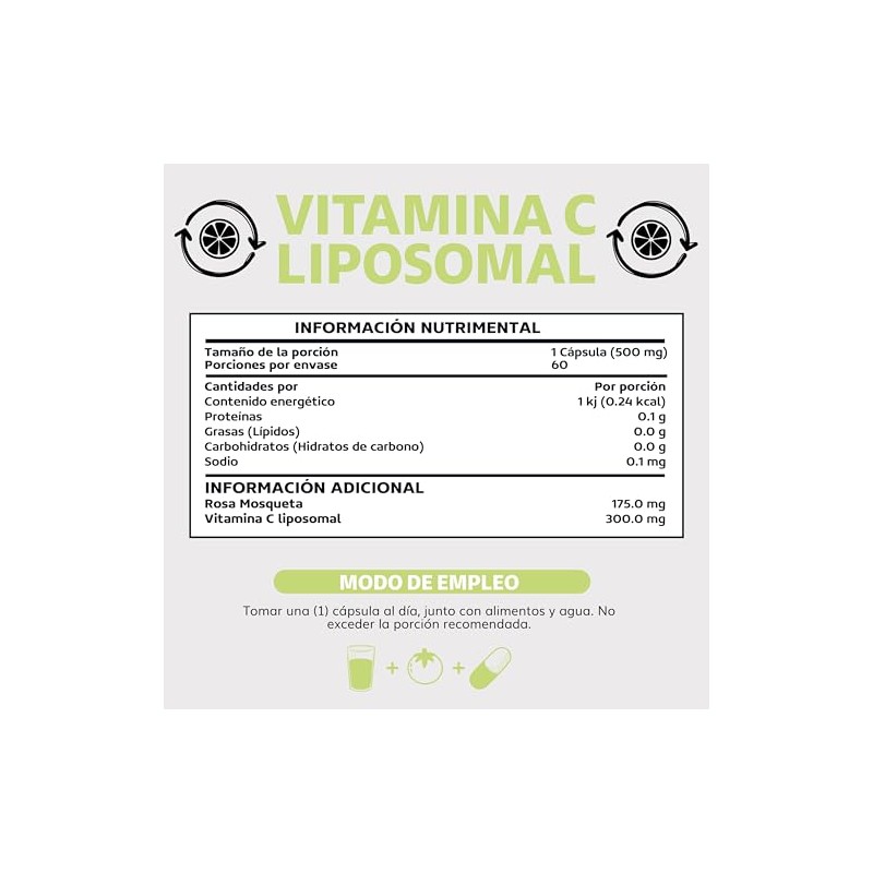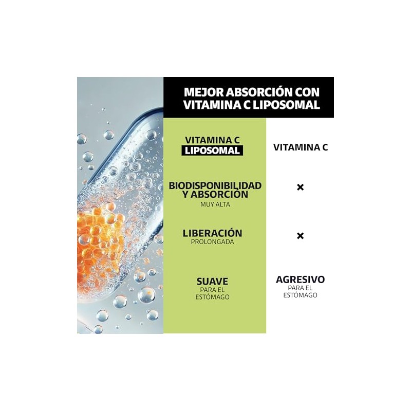 - Acerca de este artículo 🙌 LIPOSOMAS: Esta vitamina C liposomal utiliza una tecnología avanzada que encapsula la vitamina C en pequeñas vesículas lipídicas para una mejor absorción y biodisponibilidad. 👉 POTENCIADO CON ROSA MOSQUETA: Enriquecida con extracto de rosa mosqueta, una fuente natural de vitamina C y antioxidantes que complementan los beneficios de esta fórmula. 😎 ALTA CONCENTRACIÓN: Cada cápsula contiene 300 mg de vitamina C liposomal de alta calidad para satisfacer tus necesidades diarias. ⚡ FÓRMULA 100% VEGANA: Elaborado con ingredientes de origen vegetal, este suplemento es apto para dietas veganas y vegetarianas. 🔒 SEGURIDAD GARANTIZADA