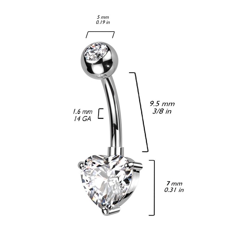 - Implant Grade Titanium With Pressed Fit CZ Top and Heart Brass Prong Set CZ Belly Button Piercing
