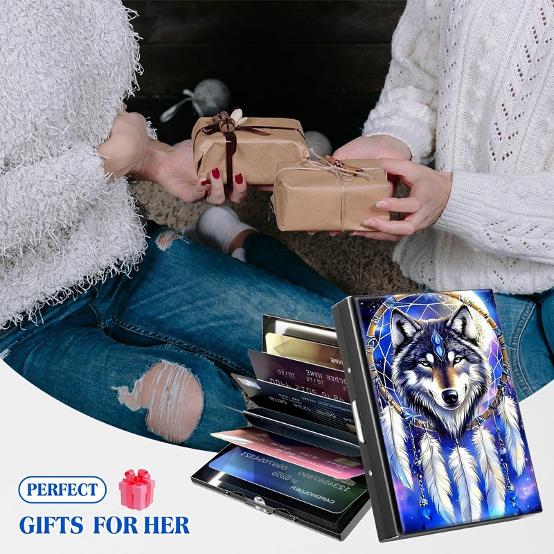 BFDHGQZC Credit Card Holder for Women Men,Dreamcatcher Wolf Mini RFID Blocking Aluminum Slim Metal Wallet Business Card Organizer ID Card Case Professional Stainless Steel Pocket Wallet