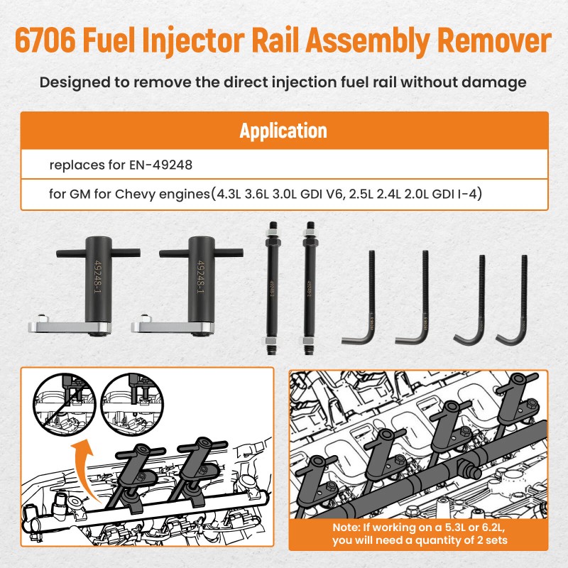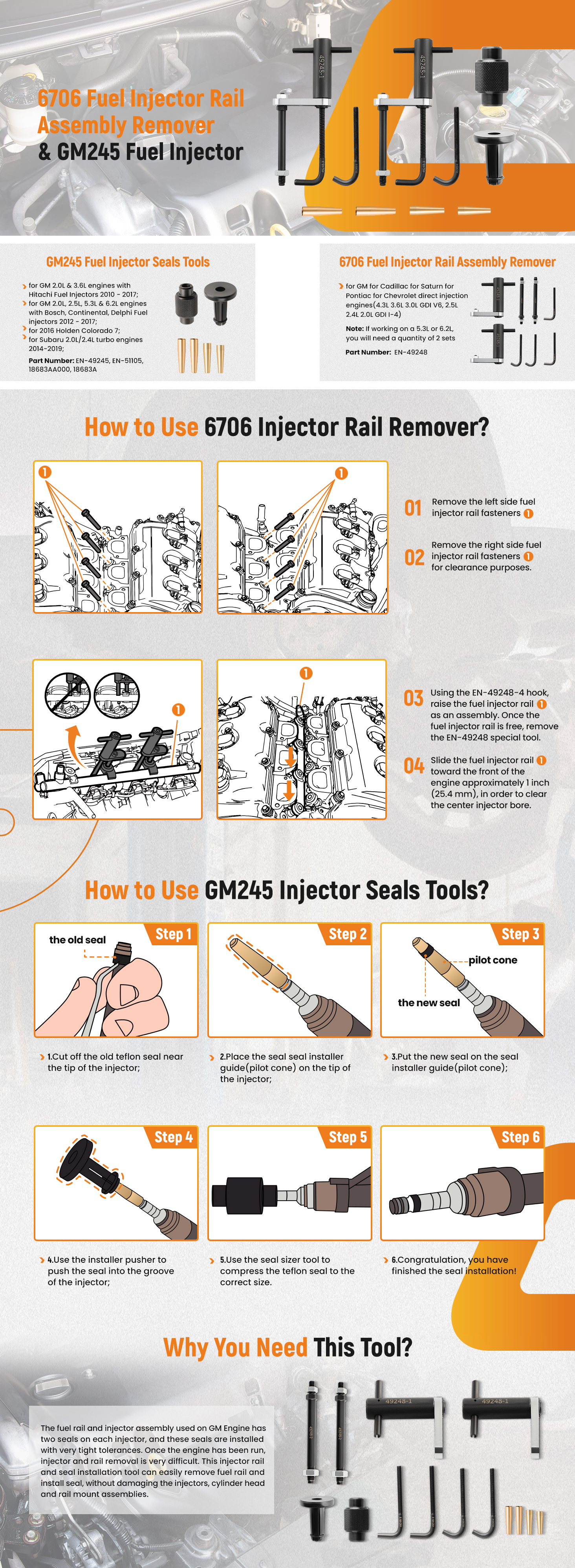 Package Includes: 6706 Injector Rail Assembly Remover Tool & GM245 Fuel Injector Seals Tool