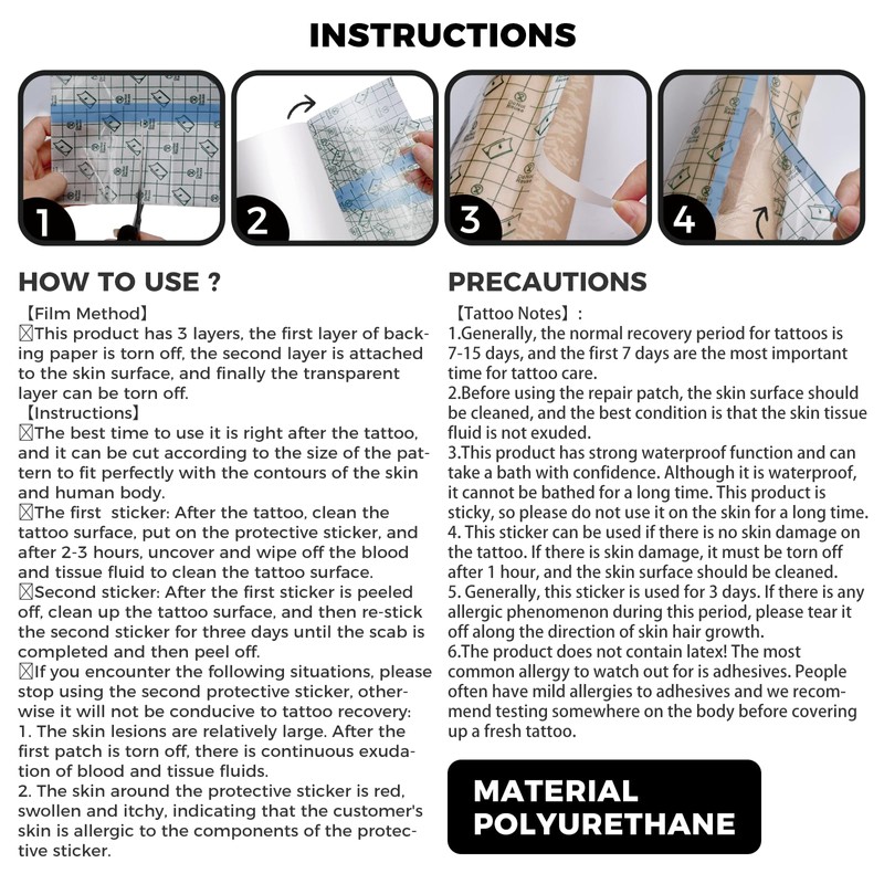 - 【Waterproof and Moistureproof】The tattoo bandage is waterproof and moistureproof to prevent any unwanted moisture from touching your tattoo ink, so you don't have to worry about showering, swimming. And you don't have to apply cream tattoo cream all day long.