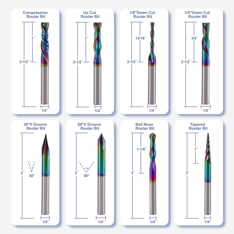 - 【Comprehensive Bit Variety】 It features essential CNC router bits for any woodworking task: tapered bits for precise cuts, ball nose bits for smooth curves, up/down/compression spiral bits for clean edge routing, and 30° & 60° V-groove bits for detailed lettering. Suitable for sign making, engraving, and working with materials like plywood, MDF, and acrylic.